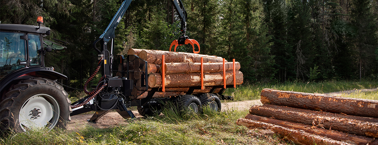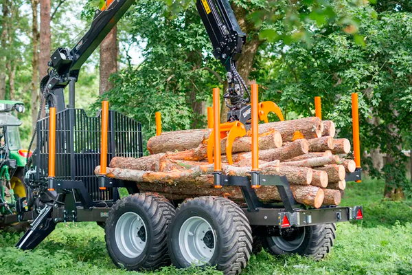 Tehokas maa- ja metsätilan yhdistelmä, jossa hydraulinen esiohjaus venttiilistö, kaksirunkoinen 8 tonnin metsävaunu modernilla pankko- ja karikkarakenteella.