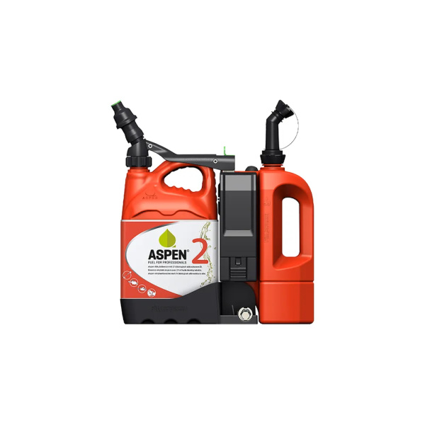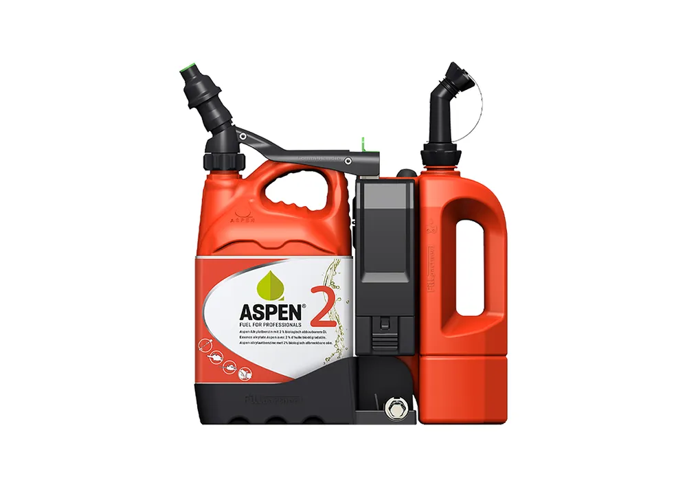 Aspen-kombikannussa bensiinikanisterille on oma jalustansa. Siihen asennetun kanisterin päälle käännetään kantokahva, jossa on kiinni automaattinokka. Jalustan reunaan kiinnittyy liukukiskolla erillinen teräketjuöljysäiliö, joka lukittuu pikalukolla paikoilleen. Säiliöiden välissä on työkalukiinnikkeet ja varustelokero, jossa tarvikkeet pysyvät kätevästi mukana.