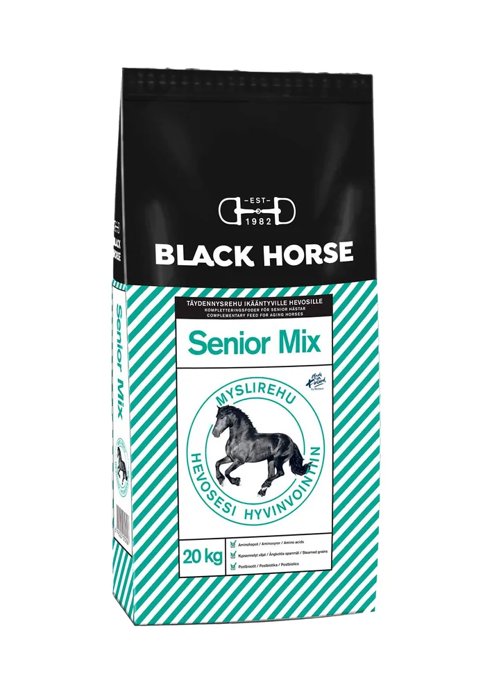Black Horse Senior Mix on myslirehu seniori-ikäisille normaalipainoisille ja perusterveille hevosille sekä poneille. Rehun koostumuksessa on huomioitu ikääntyvän hevosen tarpeet.