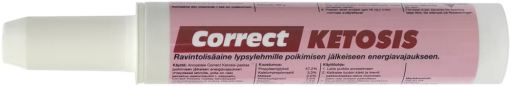 Annostele Correct Ketosis -pastaa poikimisen jälkeisen energiavajauksen yhteydessä lehmille, joilla on riski sairastua asetonitautiin l. ketoosiin. Correct Ketosis nostaa tehokkaasti lehmän verensokeria.