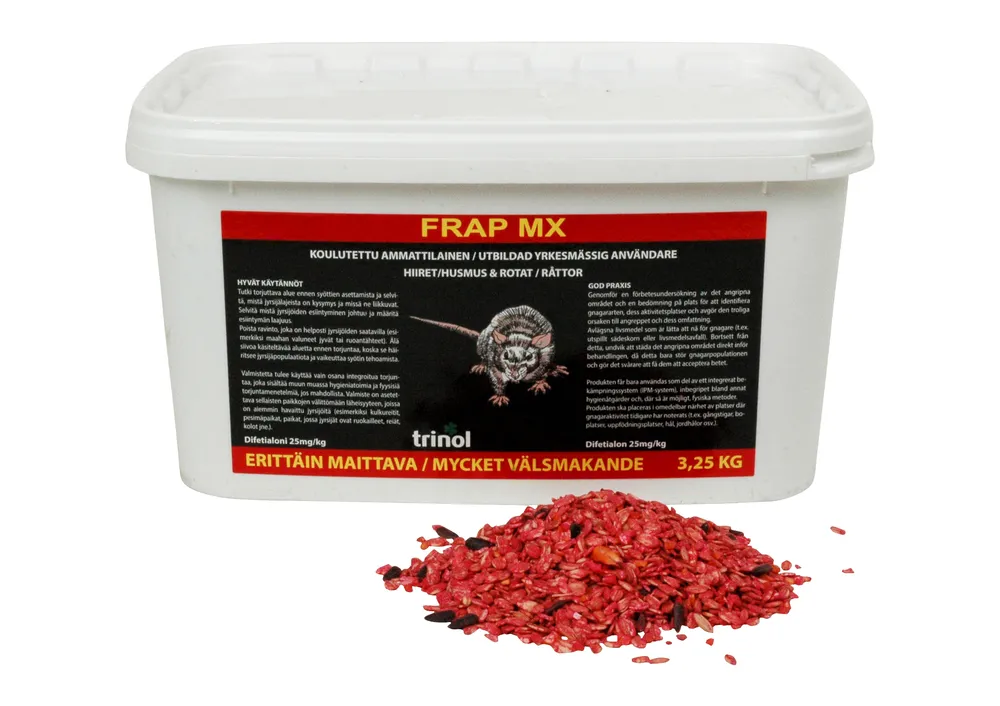 Frap MX –syötti on sisäkäyttöön tarkoitettu tuote jyrsijöiden torjuntaan. Frap MX:n sisältämä difetialoni on toisen sukupolven tehoaine jyrsijöiden torjuntaan. Yksi syöntikerta riittää normaalisti hyvään torjuntatulokseen. Frap MX:n sisältämä viljaseos (kaurahiutale, maissirouhe, auringonkukka) houkuttaa jyrsijöitä ja sopii siten erinomaisesti maatilakäyttöön tai muihin kohteisiin missä jyrsijöille on muutakin ravintoa tarjolla. Tuote on lähes pölyämätön. Irtosyötti on helppo annostella joustavasti tarpeen mukaan.