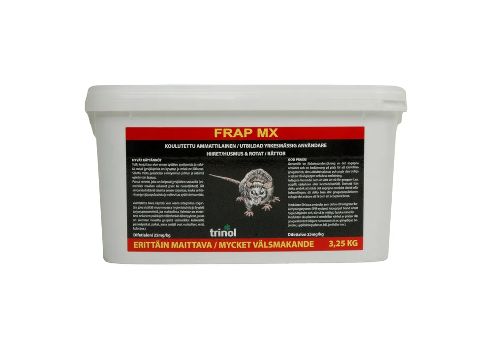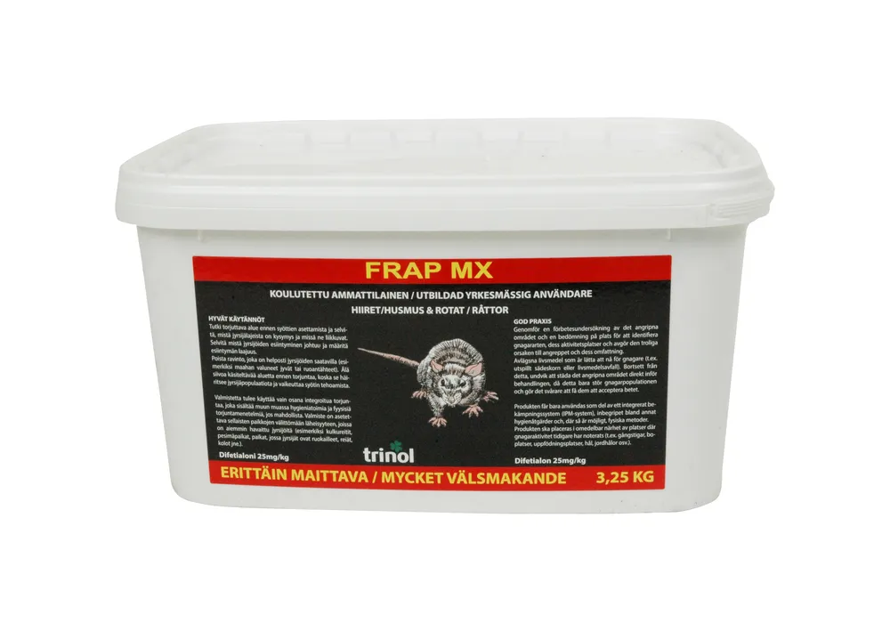 Frap MX on ammattikäyttöön tarkoitettu jyrsijöiden torjunta-aine. Ostaminen ja käyttö vaatii voimassaolevan kasvinsuojeluainetutkinnon. Jatkuva syötitys jyrsijämyrkyillä ei ole sallittua.