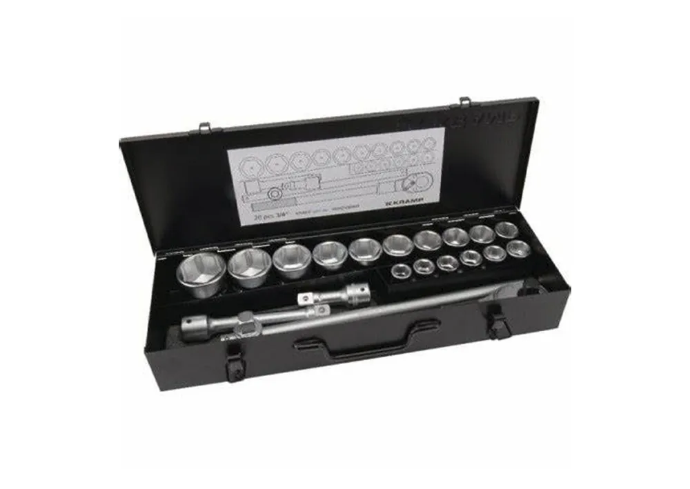 Ammattilaatuinen 20-osainen hylsysarja, joka sisältää hienohampaisen räikkäavaimen ja erilaisia kromivanadiumteräksestä valmistettuja hylsyjä. 3/4″ vääntiö. Selkeästi jaotellussa, lujassa ja kestävässä metallikotelossa.