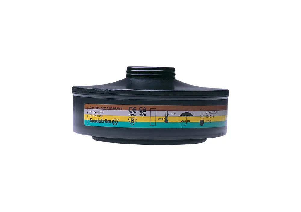 Kaasunsuodatin SR 579 ABEK suojaa A, B, E ja K-luokan myrkyllisiltä kaasuilta ja se soveltuu Sundström SR 500-puhallinsuojaimeen