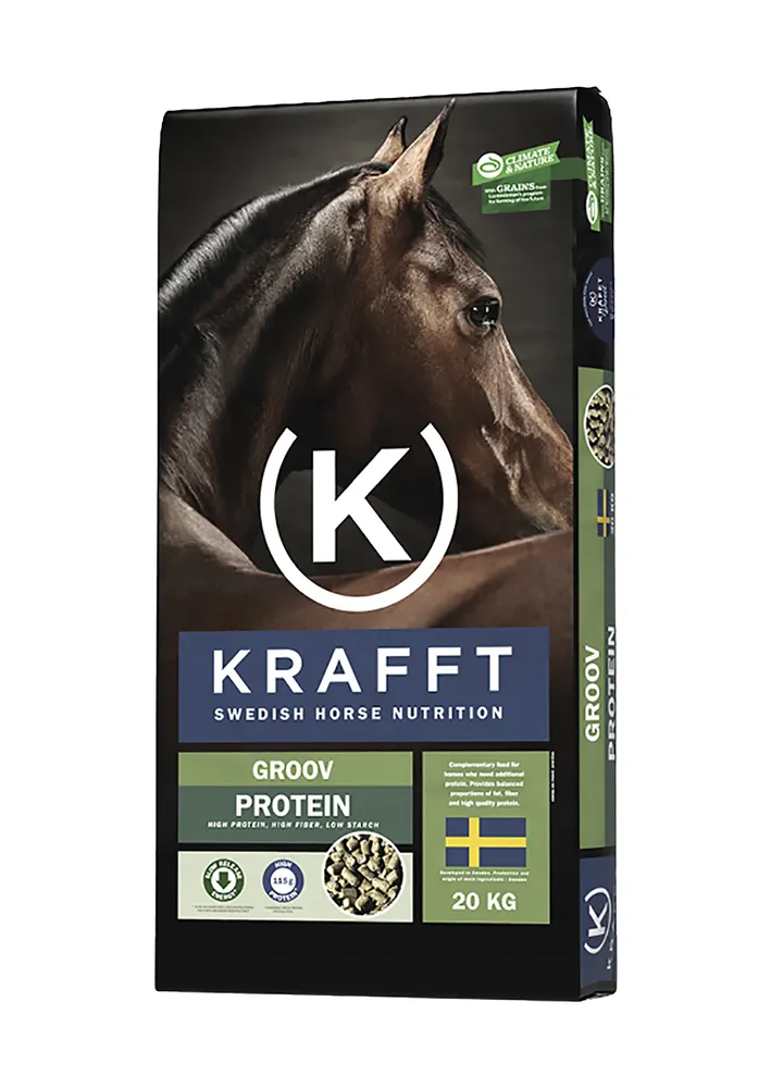 Krafft Groov Protein on täydennysrehu, josta hevonen saa riittävästi laadukasta proteiinia ja kuitua. Sitä voidaan käyttää ainoana väkirehuna karkearehun kanssa tai yhdistää muihin väkirehuihin. Rehussa on paljon hyvin sulavaa valkuaista ja se sisältää runsaasti elintärkeitä aminohappoja. Groov Protein sopii valkuaispitoisuudeltaan matalan karkearehun rinnalle ja erityisesti hevosille, joilla on kasvanut proteiininntarve. Rehu sisältää hitaasti vapautuvaa energiaa. Pellettikoko on 8 mm.