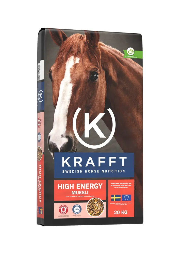 Krafft High Energy Muesli on höyrykypsennetty täysrehu kilpahevosille, joka sisältää nopeasti vapautuvaa ja räjähtävää energiaa. Sisältää runsaasti rasvaa ja keskivertoa enemmän proteiinia. Sopii hevosille, jotka tarvitsevat tavallista enemmän nopeasti imeytyvää energiaa suoriutuakseen, tai vaihtoehtoisesti hevosille jotka tarvitsevat enemmän rasvaa.