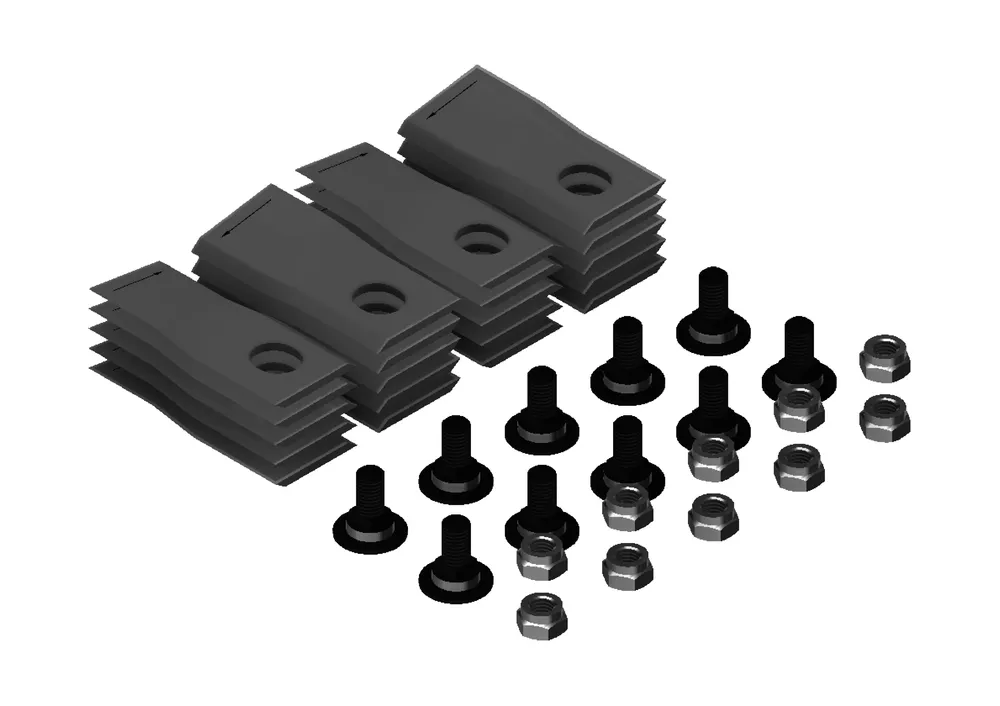 Teräsarja Elho-niittokoneeseen. Sarjassa on 20 kpl 112 mm pitkiä teriä (10 vasemmanpuoleista + 10 oikeanpuoleista) sekä 10 kpl M20-kokoisia teränpultteja 505060.