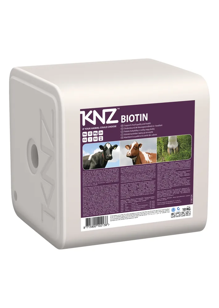 KNZ Biotin nuolukivensisältämä biotiini auttaa alentamaan sorkkasairauksia ja vahvistamaan sorkka- sekä kavioainesta sekä tukemaan eläimen yleiskuntoa. Biotiini on B-ryhmään kuuluva vesiliuokonen vitamiini, joka tunnetaan parhaiten sorkkaterveyden edistäjänä. Myöhemmissä tutkimuksissa biotiinin on havaittu myös toimivan monissa aineenvaihdunnan reaktioissa, jotka liittyvät suoraan maidon muodostukseen.