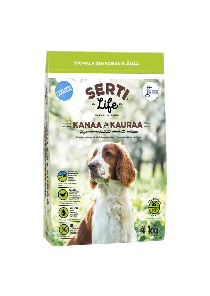 Kotimainen täysravinto kaikille aikuisille koirille. SertiLife Kana-kaura -täysravinto koirille sisältää runsaasti hyvälaatuista suomalaista siipikarjan valkuaista sekä hyvin sulavia ja monipuolisia kotimaisia eläin- ja kasvisrasvoja. Lihan lisäksi SertiLife kana-kaura täysravinto sisältää runsaasti kotimaista kuorittua kauraa. Kaura on luontaisesti gluteeniton ja soveltuu käytettäväksi koirien ruokintaan erinomaisesti.