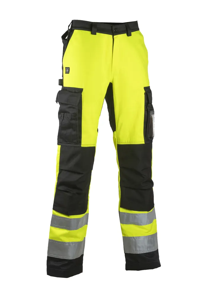 Tyylitellyt huomiotyöhousut, jotka vastaavat näkyvyysluokan 1 vaatimuksia. Housut istuvat mukavasti, ja haarakiila sekä selkäpuolelta joustava vyötärökuminauha tekevät niistä miellyttävät käytössä.